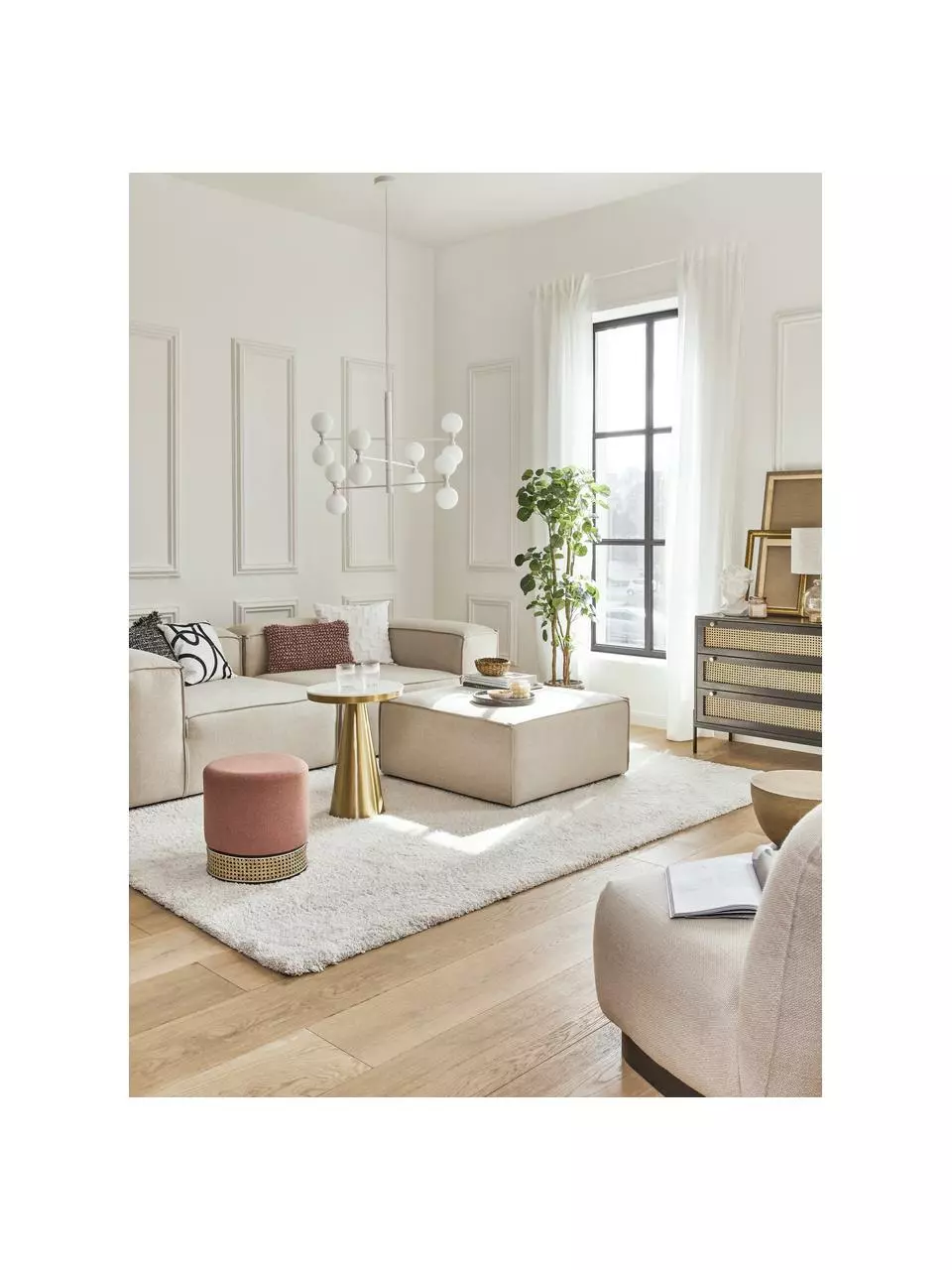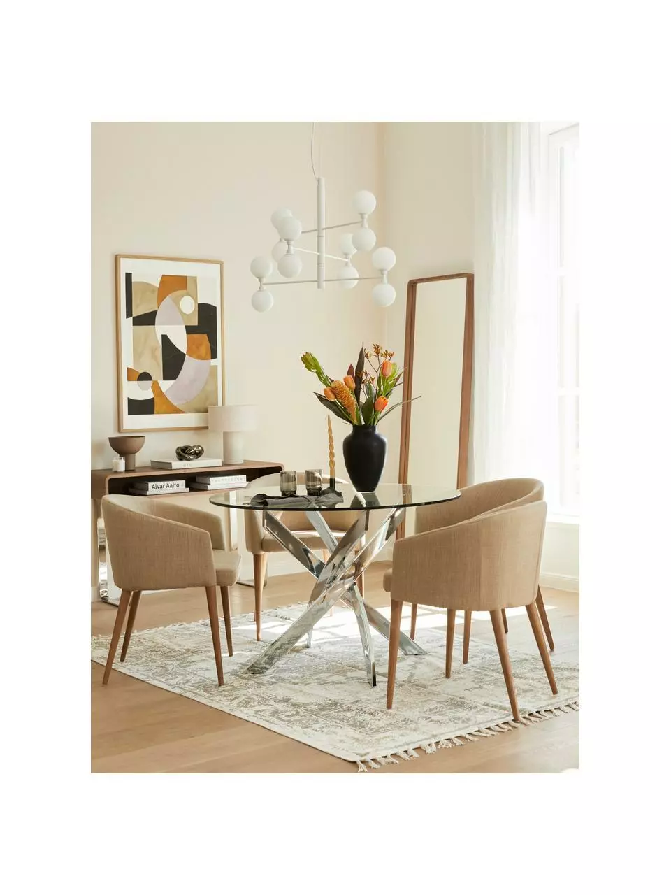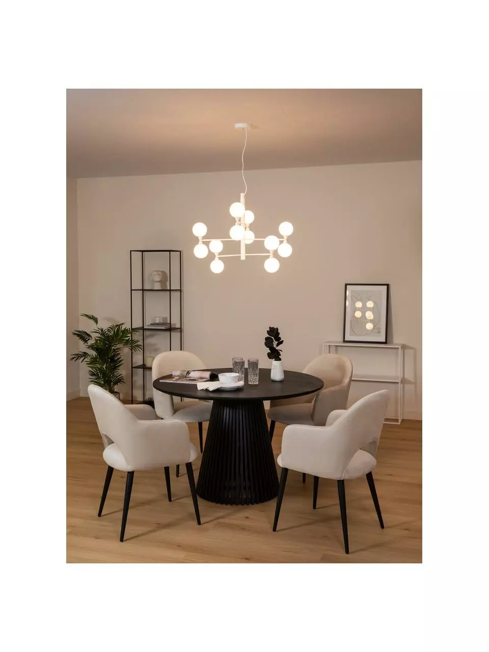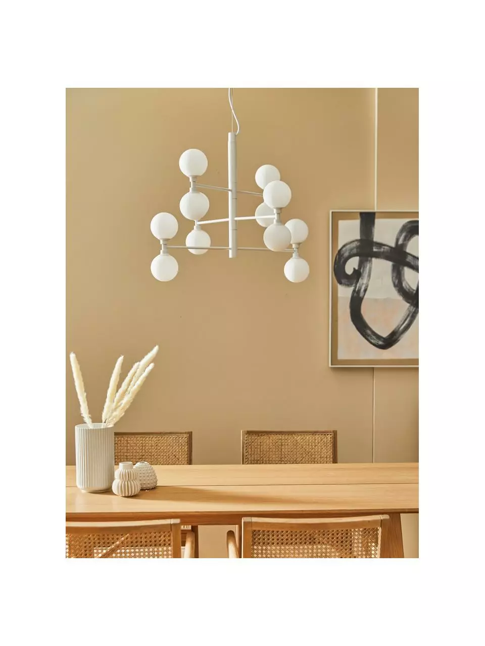 Voilà, die moderne Interpretation des Kronleuchters, die den ganzen Raum ausleuchtet: Unsere „Grover“ Serie mit kugelförmigen Lampenschirmen aus semitransparentem Opalglas. Für alle, die es glamourös mögen gibt es sie in glänzendem Gold und Silber, wer es lieber modern mag, bestellt sie in mattem Schwarz oder Weiß.