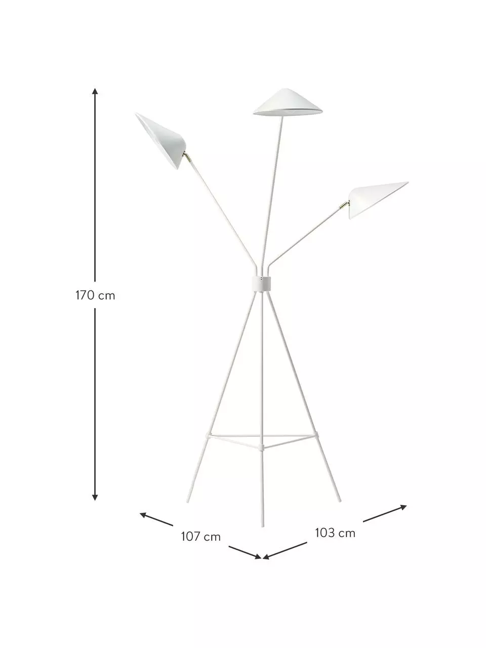 – Bitte beachten Sie, dass Tripod Lampen aufgrund ihrer ausladenden Lampenfüße mehr Platz als Standard Stehlampen benötigen.
