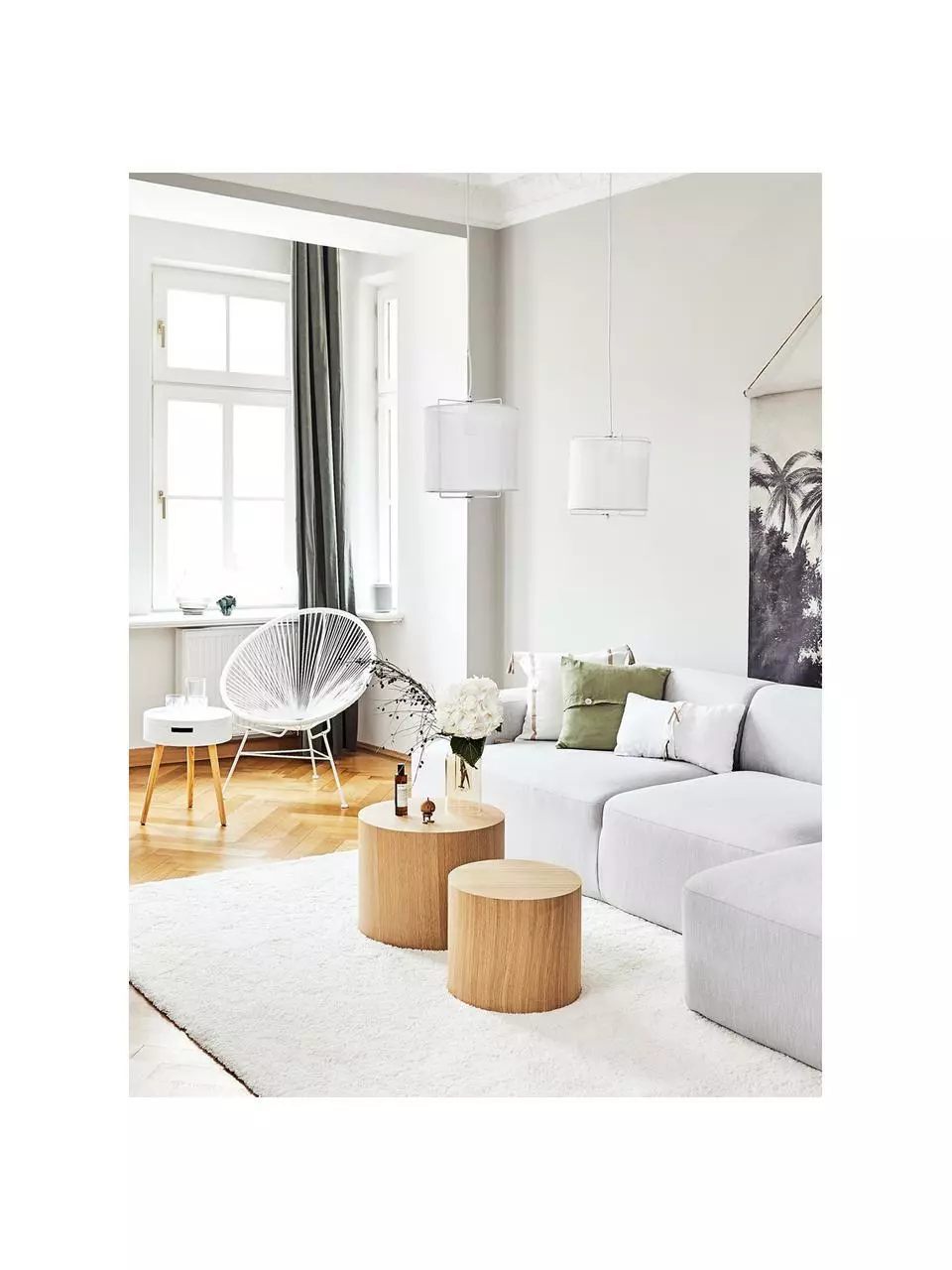 Die Pendelleuchte mit dem klangvollen Namen „Clouds“ lässt uns gedanklich ans Mittelmeer reisen. Mit ihrem modernen Design-Mix aus Skandi und Boho, dem natürlichen Leinenstoff und der gedeckten Farbwelt bringt sie den Look mallorquinischer Fincas in unser Zuhause. Licht an! So wird auch die feine Leinenstruktur sichtbar…