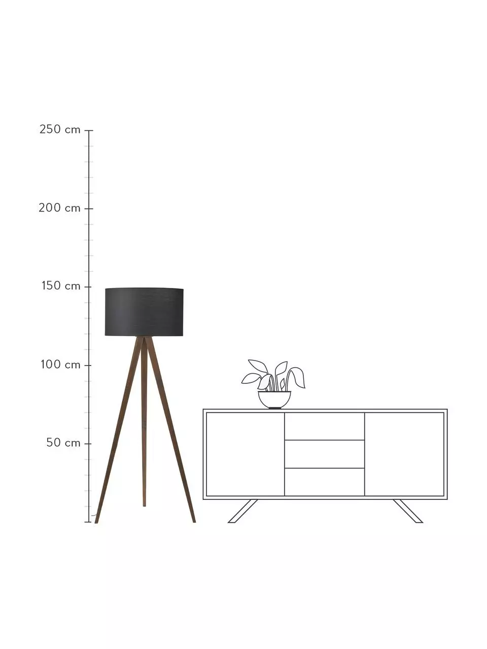 – Bitte beachten Sie, dass Tripod Lampen aufgrund ihrer ausladenden Lampenfüße mehr Platz als Standard Stehlampen benötigen.