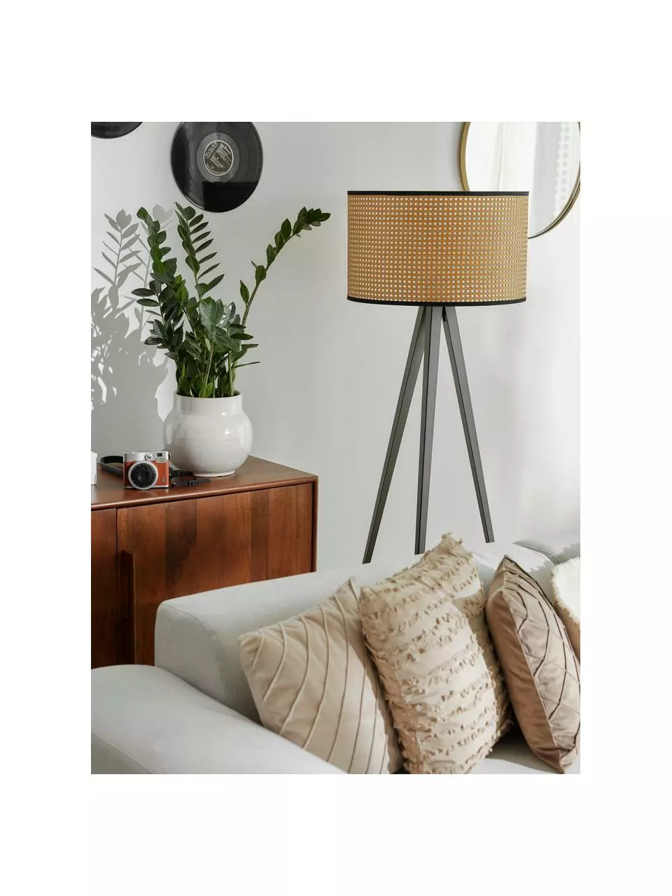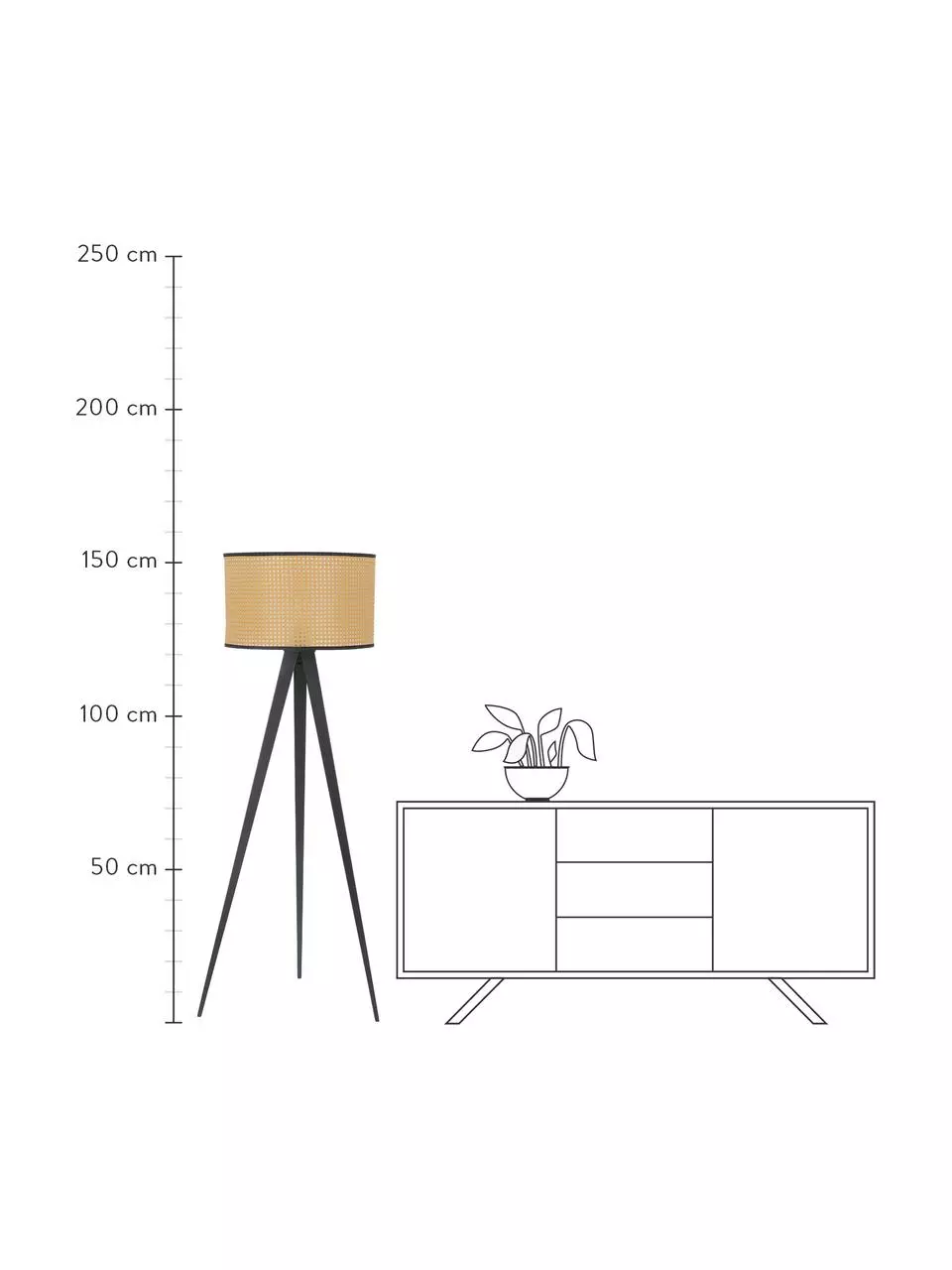 – Bitte beachten Sie, dass Tripod Lampen aufgrund ihrer ausladenden Lampenfüße mehr Platz als Standard Stehlampen benötigen.